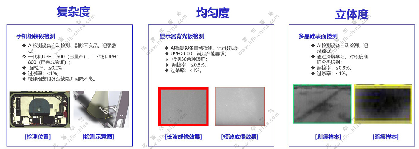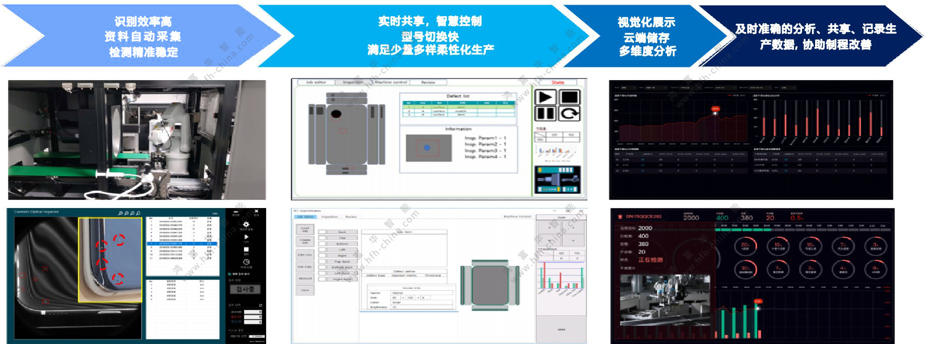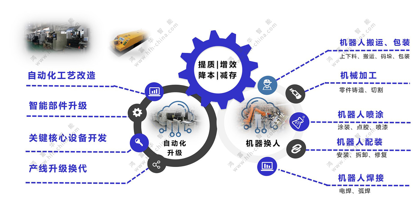 鴻富華提供自動化生產(chǎn)線設(shè)計、機(jī)器換人與設(shè)備智能化升級改造、AI視覺檢測服務(wù)。幫助企業(yè)合理的規(guī)劃生產(chǎn)線,實現(xiàn)生產(chǎn)高效、產(chǎn)線穩(wěn)定、人機(jī)搭配合理、避免投資風(fēng)險、操作維護(hù)標(biāo)準(zhǔn)化的目的。同時,通過自動化(含AI視覺檢測設(shè)備)導(dǎo)入,取代或輔助操作高頻重復(fù)及簡單、低效率、高人力成本、高體力勞動、高風(fēng)險發(fā)生、高品質(zhì)異常、高精度要求、人力檢測所難以觸及的生產(chǎn)與檢測環(huán)節(jié),以提升生產(chǎn)效率、生產(chǎn)安全性、產(chǎn)品品質(zhì),緩解工人勞動強(qiáng)度,降低整體成本。其中,通過設(shè)備的智能化升級改造,實現(xiàn)“人、機(jī)、料、法、環(huán)、測”的信息化覆蓋和數(shù)據(jù)聯(lián)通,推動經(jīng)營管理各環(huán)節(jié)的更好融合,解決工廠設(shè)備信息孤島、管理職能壁壘等問題。