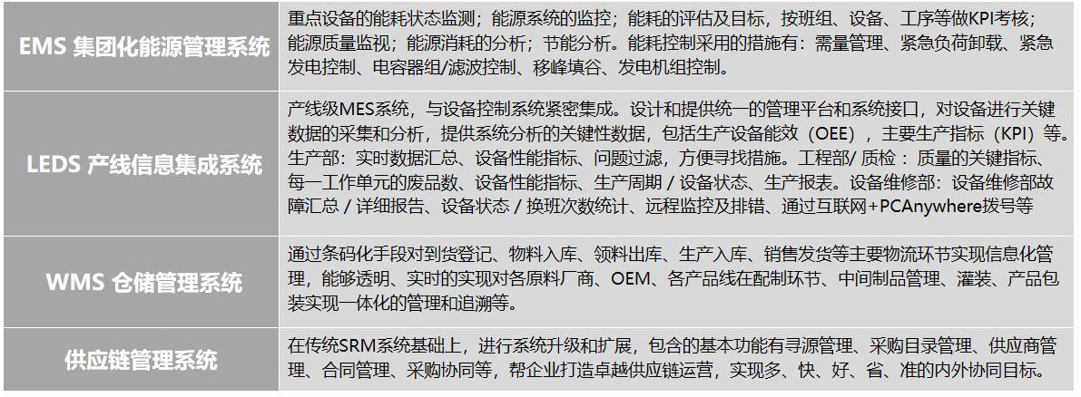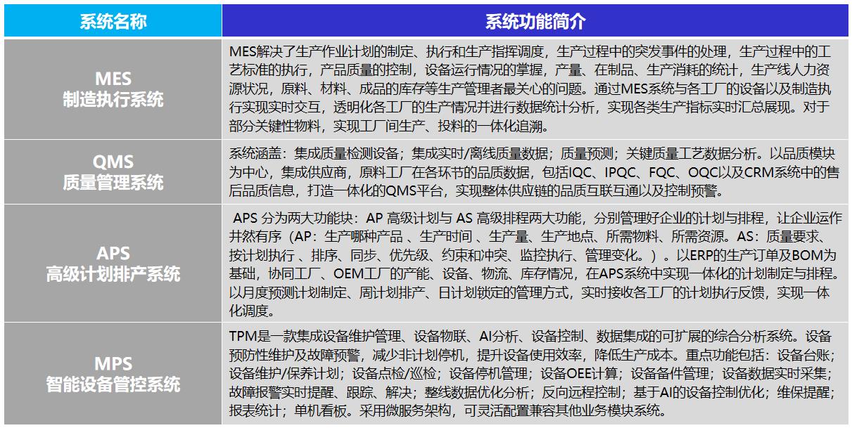 智能制造運營管理平臺,主要包含制造協同、智能決策、物聯網三個子平臺。需要實現計劃協同、生產協同、品質協同、庫存協同及生產透明化、物流一體化、管理移動化、決策數據化。信息化建設的主要模塊:制造計劃整體排產、供應鏈需求整體拉動、廠內物流智能拉動、MES與自動化對接、QMS品質分析平臺建設、訂單跟蹤全流程透明、移動APP建設等。